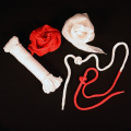 ロープとシルクを絡めたトリックを続けて演じる手順の、サロン、パーティー向きマジックセットです。まず1本の白いロープを見せて中央を結ぶと、結び目に赤いシルクが出現します「ロープに出現するシルク」。そのロープを手に巻いてシルクを結ぶと、ロープは手から、シルクはロープからスルリと抜けてしまいます「ロープとシルクのエスケープ」。次に、ロープをループ状にしてシルクを結び、「ロープもシルクも結んだままで抜き取るには?」と…、ロープを切ってシルクを外してみせます。ところが切ったはずのロープはつながってしまいます「パズル風ロープとシルク」。続けて、1枚の紙を取り上げ両面を見せて、筒状に巻いて先程のシルクを押し込み、それを吹き上げると、シルクは白く変わってしまいます。もちろん筒の中には何もありません「即席 色変わりシルク」。そして最後は、赤と白に染め分けたロープの、各々の結び目の色が交換して、さらに…?!「紅白 カラーチェンジノット」。以上、5つの驚きが、紅白をテーマに流れるように演じられます。
