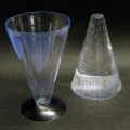 このトリックは科学に詳しい人ほど驚きます。マジシャンは、透明なプラスチックでできた円錐状の透明なグラス(高さ12cm・口径7.5cm)を見せます。そのグラスの縁まで水を満たし、さらにその口をハガキもしくはジャンボカード等で覆います。そして、グラスごと逆さまにしてしまいますが、水はこぼれません。しかし、お客様の中には『科学の原理だ』ということがすぐに解って、指摘してくる人もいるでしょう。他のお客様もそう思います。マジシャンはそのことを認めた後で、ゆっくりとハガキを取り外してしまいます。それでも水はグラスからこぼれ落ちません。さらにナント、逆さになったグラスをそのままテーブルの上に置いてしまうのです。そして、置いたグラスをゆっくりと持ち上げます。すると、なんということでしょう! 水は固まったまま、凍った状態でグラスからでてきたではありませんか! 「引力を否定するグラス」(G5235)や「アトミックウォーターベース」(M5521)をさらに上まわる驚異のトリックです。