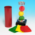 やさしくて効果満点!しかも色々な応用ができる変換現象のトリックがリニューアルしました。マジシャンは、3枚の異なった色のスカーフ(20cm角)を見せて、これをスタンドに立てられた透明な筒(高さ25cm・直径6.5cm)に入れます。そして、この透明筒に不透明の筒を被せて、直ぐに筒を取ると、3枚のスカーフは各々スカーフと同じ色の3個のボール(直径60mm)に変化しています。筒からボールを取り出し、スカーフが完全にボールの変わったことをよく見せます。たいへんわかりやすくて見栄えのするマジックですから、小さなお子様やお年寄り相手のショーにもお勧めです。他にも、別売の各種「スポンジボール」(U1121他)の手順との併用や、固形の品物、大型の各種「デザインシルク」(S8557他)等を出現させることもできます。それからお子様相手のショーでは、スカーフをお菓子に変えてもよいでしょう。また、3枚の白いシルクが本物のタマゴ…といった演出も可能です。(ボール・スカーフ等用具一式付き。)(デザインは写真、イラスト、動画と一部異なります。)