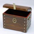 明治時代、超魔術の魁(さきがけ)とも言える、「稲荷魔術・取寄せ箱」として、亜細亜卍や神道斎狐光らが演じて大当たりをとった有名なトリックです。その地方の名物を霊狐が箱の中に取寄せる、といった神秘的な演出で、中でもお客様の指名した品物をその場で取寄せて見せる演技は全国各地で大好評を博しました。また、海外では「アラビアンナイトの宝箱」と題して完全にカラなことをよく見せた箱から王冠・豪華な宝石類・花束・小ウサギ等を取り出しています。ここにお届けするのは、厚さ10mm以上の天然木を使用した、縦25cm・横38cm・高さ32cmと、大きなステージにもピッタリの製品で、箱は1つずつ丁寧に手作りされ、何度もニス塗りを繰り返し、更に装飾金具をふんだんに使った、美しい造りになっています。内側もビロードを全面に貼りつめた、これ以上ないほど贅沢な用具です。説明書には貴重な稲荷魔術の演出の例まで解説してあります。<小型の製品に「アラビアンナイトの宝箱」(W5404)があります。>