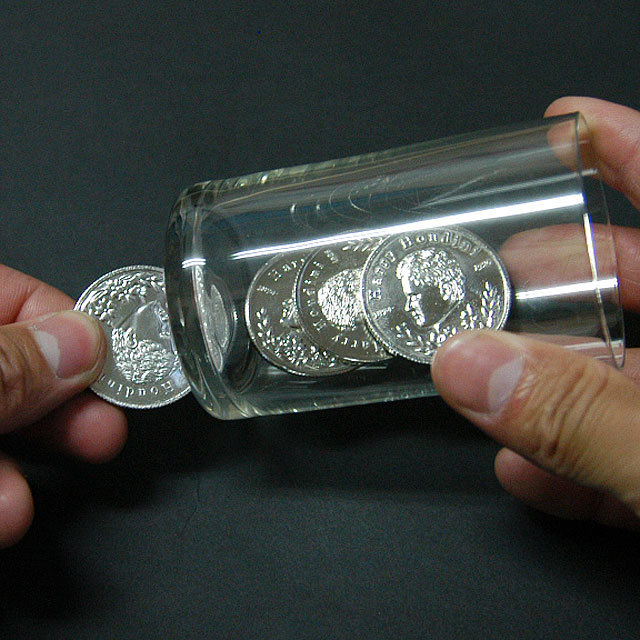 O2106A)と並んで応用範囲の広いトリックです。マジシャンは1枚のコインを手の中に握るとコインは2枚に増えています。そして、2枚のコインを両手に1枚ずつ握ると、片方のコインがもう片方に飛び移ります。次に1枚を取り上げ、もう1枚を握ると、握ったコインが消えてしまい、さらにはポケットに入れたコインが手の中に…と、増加、消失、移動等の現象が次々に演じられます。フーディニーコインを使用した、コインマジシャン必携の製品!高品質・低価格! 特別にデザインされ、研究・開発された高級感あふれるオリジナルコインを、特別価格でお届けいたします。なお、この商品は特製ギミックコインのみの販売です。レギュラーコイン<「フーディニーコイン」(