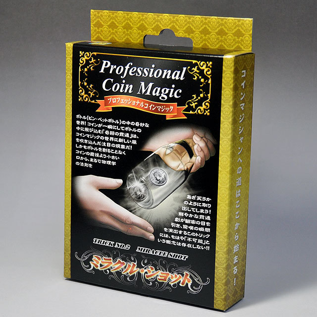 マジシャンはコインとカラのビンを両手に持ち、コインをビンの底に打ち付けます。すると、コインはビンの底を貫通して中に飛び込んでしまいます。もちろん、ビンの口はコインの直径よりもはるかに小さいので、入るはずもありません。おなじみの「フォールディング コイン」ですが、「プロフェショナル コインマジック」シリーズの特製フーディニーコインは、両面とも同じ肖像のデザインになっていて、そのデザインに合わせてプロフィールカットされていますから、どちらの面から見ても完璧にギミックをカモフラージュしています。しかもカット面の凹凸を極力減らして、狭いスペースからでもスムーズに挿入することができるようにいたしました。その扱いやすさをぜひあなたもお試しください。この特製コインを使用すれば、プロマジシャンが演じるような、より高度な演技を比較的簡単にマスターできます。(ギミックコイン1枚とレギュラーコイン1枚に、ギミック用輪ゴム付き)