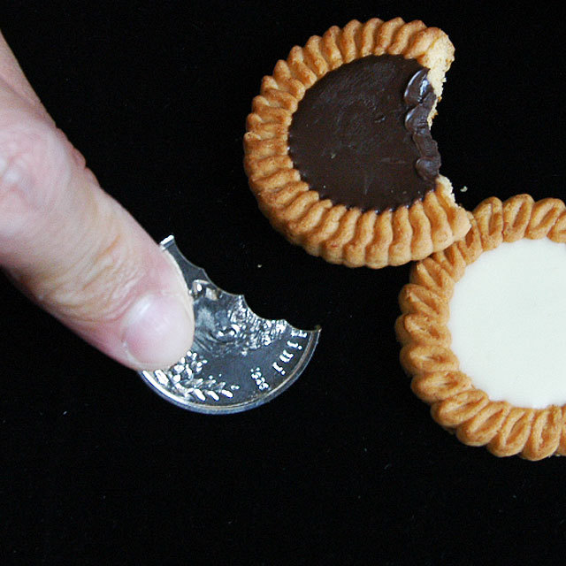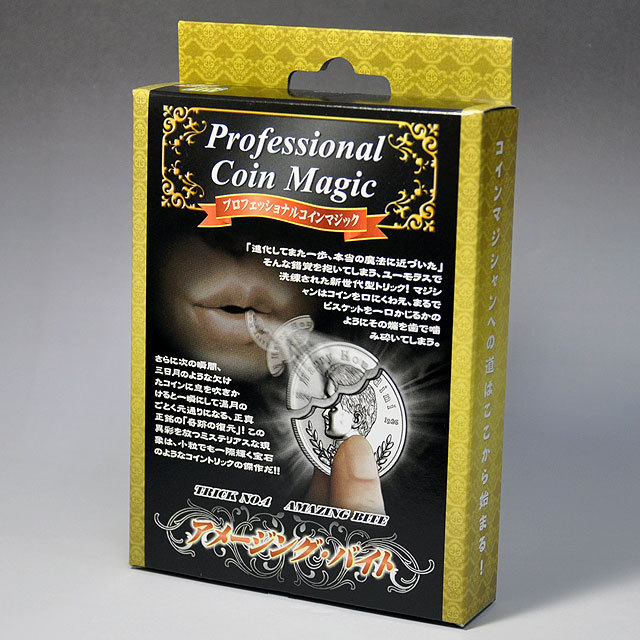 テレビでも人気のコイントリックが「プロフェショナル コインマジック」シリーズに! マジシャンは1枚のコインを指先に持ち、なんとコインの端を口にくわえて、まるでビスケットを一口かじるかのように噛み切ってしまいます。コインはきれいに歯形の通りにかみ切られています。そこで、口の中の噛み切ったコインのかけらを、持っているコインに向かって「フッ」と吹き付けて飛ばします。するとどうでしょう! コインは一瞬にして元通りに復活してしまいます。不思議さの中にもユーモアたっぷりの仰天トリックです。ギミックの特製フーディニーコインは、贅沢にもコインのパーツを4つに分けて制作し、それを巧みに組み合わせることによって、普段のコインの自然な状態・かみ切られたときのリアルな形状・角度の強さ等々、まさに完璧なギミックコインに仕上げました。(ギミックコイン1枚とレギュラーコイン1枚にギミック用輪ゴム付き)