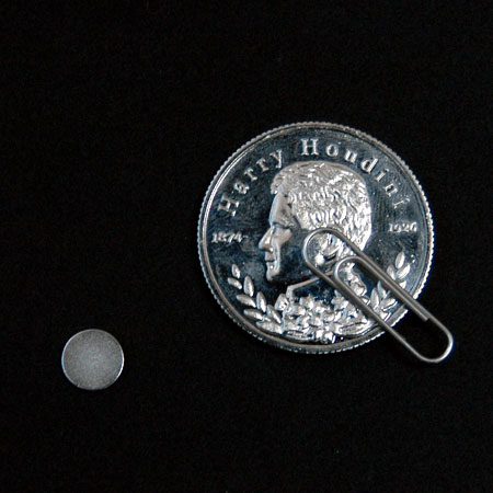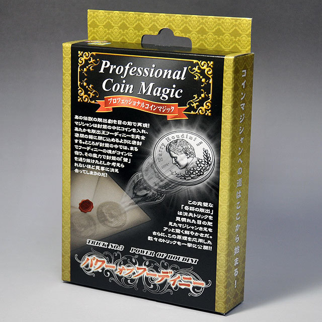 プロフェッショナル コインマジック」シリーズの中でも、たいへん応用範囲の広い便利なトリックです。例えば、封筒に確かに入れたフーディニーコインが、お客様の目の前で封筒の中から忽然と消えうせてしまいます。そして、コインは思わぬ所から出現するのです。また、グラスの口に乗せたカードやデック(一組のトランプ)を貫通して、コインがグラスの中に入ってしまったり、テーブル上に離して置いたコインの各々をカードでカバーすると、なんとコインが片方のカードの下から消え、もう片方のカードの下に瞬間移動して集まったり…といったように、摩訶不思議な現象を次から次に演じることができるのです。用具は、特製ギミックコイン1枚とレギュラーコイン1枚、専用カード、付属ギミックをセットして、さらにボーナステクニックの解説まで付けてお届けいたします。(封筒は付いていません)