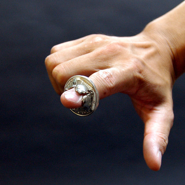 コインを投げ上げ「オリャッ!」と、マジシャンが 指先を突き出すと、何とコインの中央を打ち砕き、突き抜いてしまう! コインの反対側からは指先が飛び出し、周りは四方・八方に裂けて捲れ上ってしまう、 この劇画でしかあり得ない超人的な技に、観客は震撼し、やがて喝采の拍手と笑いが…。フーディニーコインを使用した「プロフェッショナル コインマジック」シリーズでおなじみの「カラテ エキスパート」をギミックコインのみでお届けします。ギミックの特製フーディニーコインは、指が貫通したときの裂け方・めくれ上がったリアルな形状等、完璧なギミックコインに仕上げてあります。さらに、「アメージングバイト」(